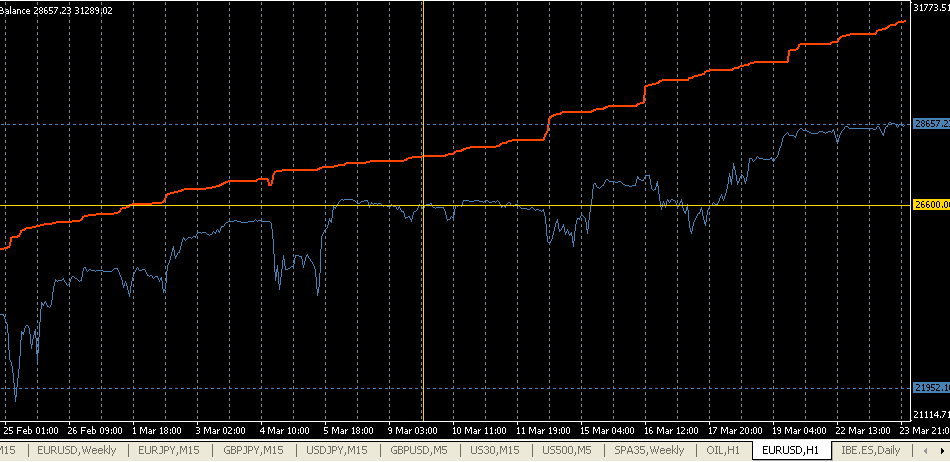 Esa operativa la conozco, requiere menos atención que la que yo practico y se que hay mucha gente que habla bien de ella aunque personálmente nunca la he testeado.Gamelu escribió:Buenas spirit, felicidades por el sistema, y sobre todo gracias por compartir esta informacion con el resto. Hace tiempo que practico una operativa con hedgind , la conoci en el foro de forex hermano a este, operativa en la que abres 4 posiciones simultaneamente, hedge de eur /usd y hedge de gbp/usd , la diferencia es que a la hora de cerrar posiciones se hace por parejas, coges por ejemplo el long eur/usd y short gbp/usd, de da una ganancia de +40 pips por ejemplo, luego se trata de cerrar la otra pareja con una perdida inferior, los DD suelen ser bajos, ya que haces covertura con el otro par. El doble de comisiones, pero como la opero en marketiva que no cobra nocturnidad ni por hedge ni na, es rentable, mantengo las posiciones sin ninguna prisa de cierre.