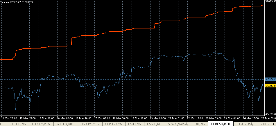 He conseguido que arranque en positivo balanceando posiciones (bueno, puede empezar oscilando, pero cuando pilla la primera tendencia en cualquier par se pone en positivo), hasta que, por el funcionamiento que tengo ahora, queda bastante estático en la operativa, y la equity fluctúa de forma muy predecible, como se ve en el gráfico.