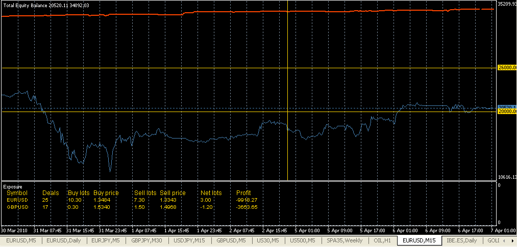 No empiezo directamente con un buy y un sell... tengo una lógica de entradas. Puede que entre un buy, se me ponga en positivo y luego entre un sell, con lo que partimos de positivo a la hora de ir cerrando parcialmente las posiciones para aumentar el beneficio. De hecho, de los 7 pares con los que trabajo ahora, siempre quedan 3 o 4 en positivo una vez todos han abierto sus lados. La cuestión después es ir balanceando las posiciones. Por ejemplo, si tengo muy comprado el Euro, puedo rebajar la buy del EURUSD, EURJPY o EURGBP, la que más me convenga, y lo mismo con el USD. Si aún por encima lo automatizas, todo se suaviza, y te permite muchos deslices, ya que el ruído de los pares "indirectos" se va aprovechando para compensar posiciones perdedoras.Spirit escribió:prefiero posicionarme desde el inicio o buy o sell y luego si he metido la pata es cuando comienza el hedging. Pero entiendo perféctamente el planteamiento y como utilizas el volumen inicial como límites de apalancamiento. El proceso de balanceo debe ser muy parecido. Tiene una ventaja este planteamiento tuyo, comienzas desde un inicio con volumen, por lo que no tienes que forzar al hedge para que se apalanque algo y genere suficiente rendimiento.