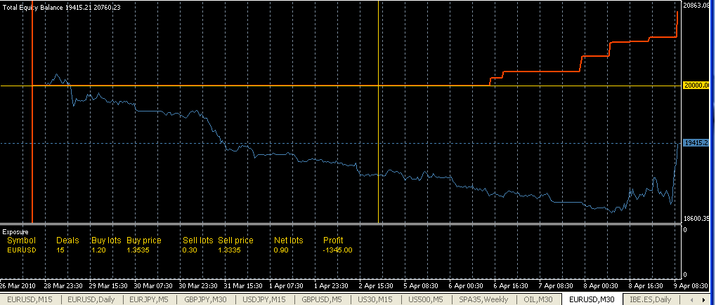 No debemos olvidar que esta semana estamos sufirendo las consecuencias de un hipergap en el eur/usd que nos pilló a la contra y en un extremo del hedge, además de venir de un gran DD. Es decir, es muy complicado que coincidan tantas variables a la contra, cosa que es de agradecer que haya ocurrido, porque entre otras cosas es lo que se buscaba en un principio: ver al hedge contra las cuerdas.