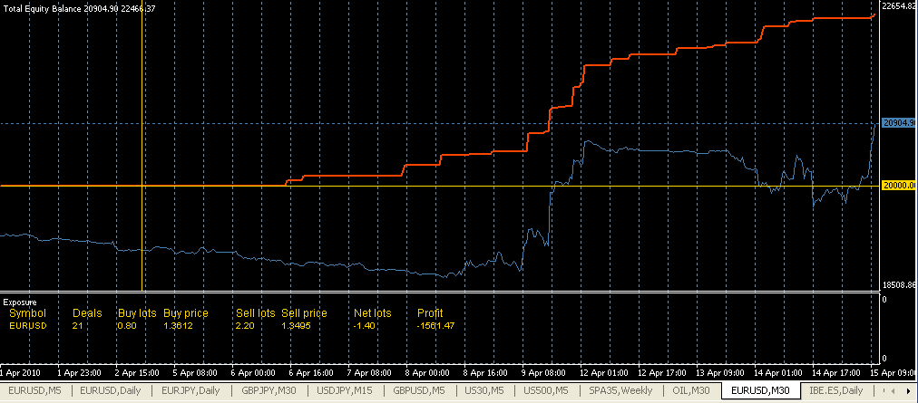 La prueba de esta tarde en el hedging3.0 ha sido un éxito, lo que he visto en el gráfico del balance-equity me gusta mucho y aporta mayor versatilidad al sistema, incrementando su estabilidad. Ahora a ver como aplico ese "cocepto" al 2.0