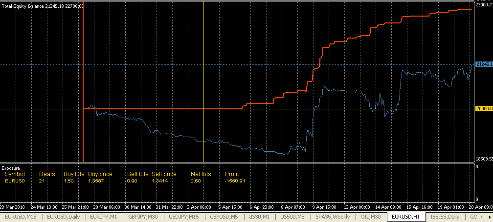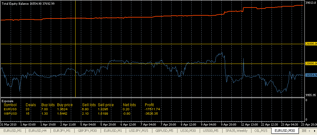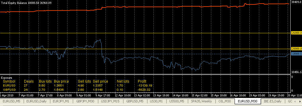 Este es lo más aburrido que te puedes encontrar. Ya pillará la tendencia buena, mientras con que se pague los gastos de estancia full-time (24X7X365) tengo más que suficiente, ya romperá el eur/usd algún día si le da la gana y es entonces cuando tiene que ganar por las semanas y/o meses anteriores. Se debe procurar mantener el hedge sin grandes desequilibrios y aprovechar los cierres de ajustes para compensar costes de swaps, rollovers, etc.