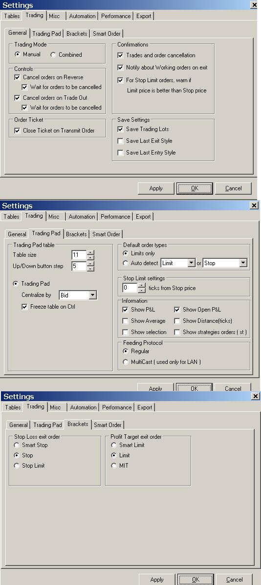 Haz unas capturas de pantalla de los menús que te salen en Settings >> System Options... >> Pestaña Trading. Haz captura de cada una de las subpestañas: General, Trading Pad, Brackets y Smart Order. Puede que sea algo de la configuración de las órdenes.