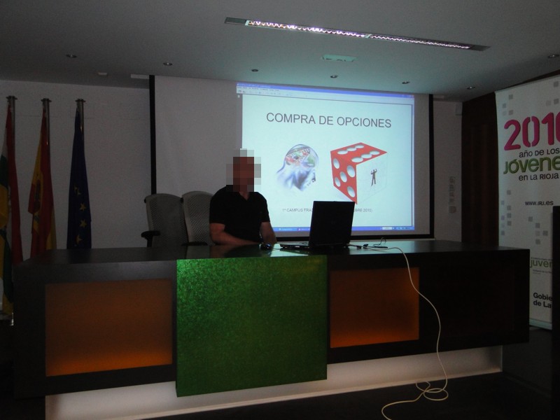 Aunque el tema era de opciones que a muchos puede pillar fuera de juego, por su complejidad, en este caso, al ser estrategia de compra, sin montajes raros de mariposas , ni conos, etc., permitió que cualquiera, aun sin conocimientos de opciones, pudiera seguir su ponencia.