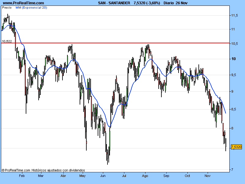 Te pongo el gráfico de Santander sin y con ajuste de dividendos para que lo veas claro,ambos son de la misma plataforma,ProRealTime
