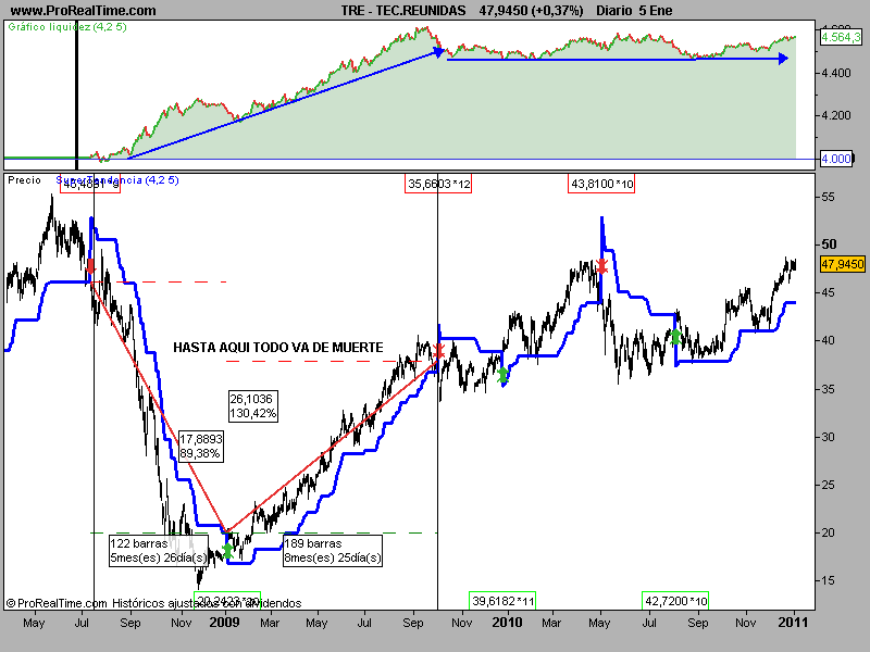 Analizando el grafico, vemos que tiene una raya que le llama supertendencia, y que cuando el precio la cruza, nuestro forero compra o vende (segun el sentido del cruce), y tambien vemos o intuimos que la propia ralla supertendencia le sirve como stop (o eso me figuro yo)...