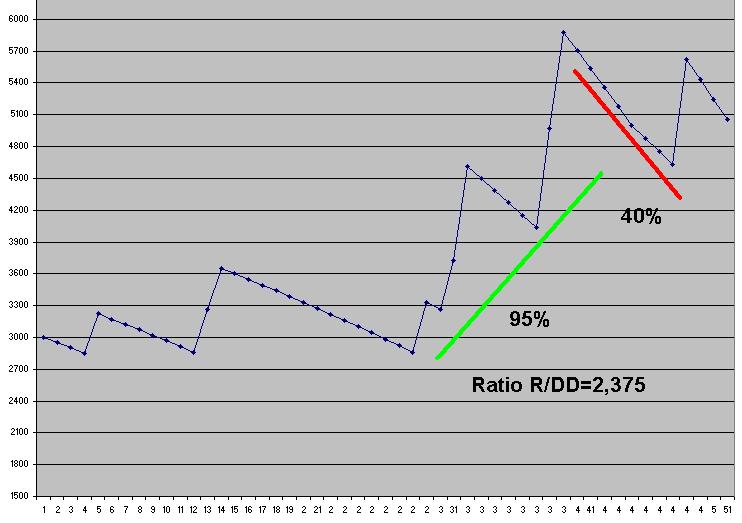 Esta simulación da por hecho unos ratios R 8 y fiabilidad sobre el 20% (la función aleatoria aquí se encarga del desvío, ya que a veces encontramos desvíos donde tenemos unas fiabilidades menores de 10% y otras mayores del 30%), las comisiones estan incluidas pero no los deslizamientos, cabe decir, que la variable que más nos colea es los ratios R 8, ya en muchos contextos de mercados estos ratios son imposibles de conseguir...y además tenemos gaps por medio, y deslizamientos que en algunos casos por cierre de día, etc son excesivos y desvirtúan esto como una ciencia, pero si sirve para ver si con estos ratios y este MM, las probabilidades estarían de nuestro lado.