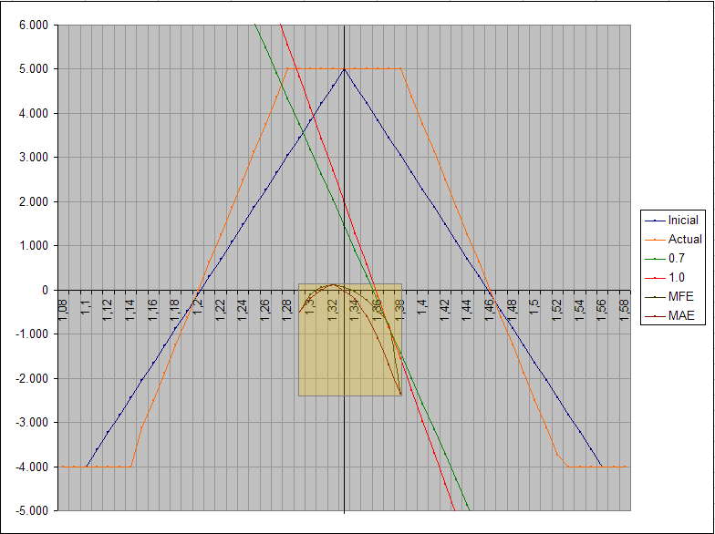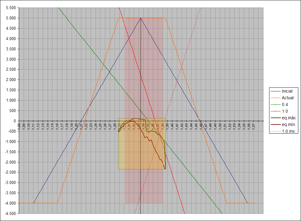 En el segundo gráfico he añadido dos curvas que indican la máxima y mínima équity en cada nivel del precio. Se puede comprobar como se ha ganado 1000 euros con respecto a la pasada anterior por la zona de 1,37. La zona amarilla es la que ha recorrido el precio (X) y la équity (Y), durante este año.