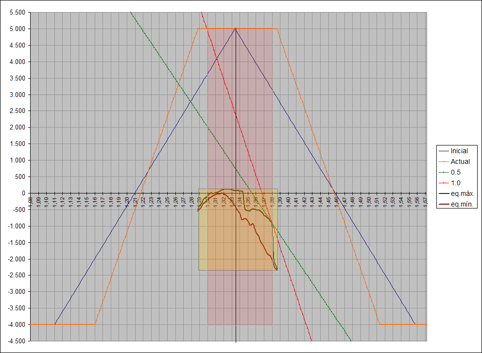 En el segundo gráfico he añadido dos curvas que indican la máxima y mínima équity en cada nivel del precio. Se puede comprobar como se ha ganado 1000 euros con respecto a la pasada anterior por la zona de 1,37. La zona amarilla es la que ha recorrido el precio (X) y la équity (Y), durante este año.