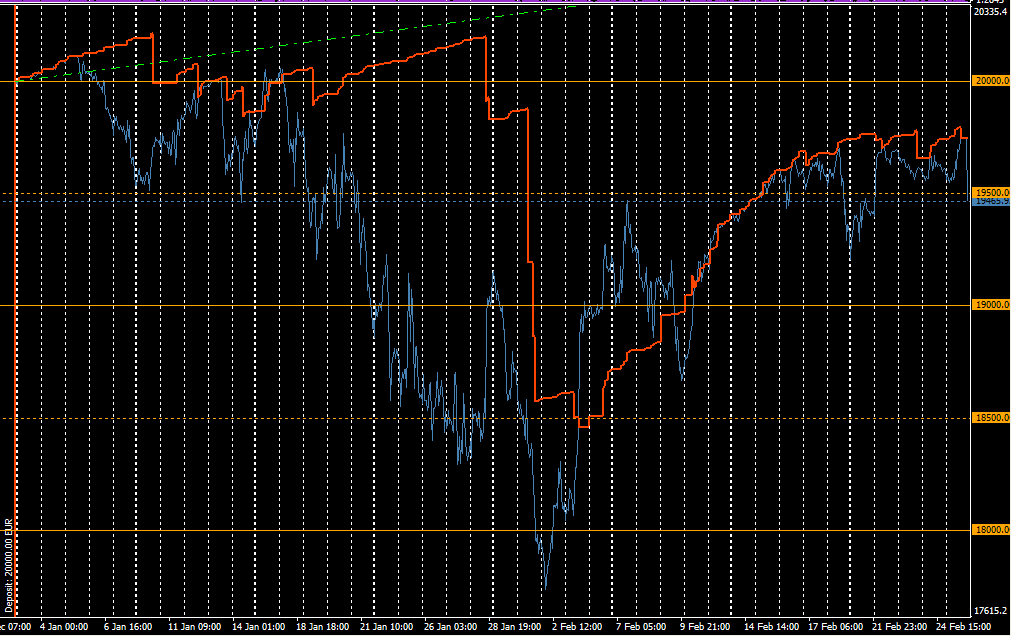 En la borágine de intentar ajustar todo rápidamente se le fue el dedo al que dispara y cerró todas las operaciones de la cuenta A!!!!!!! Esto sólo afecta al gráfico, no afecta al sistema ni tampoco a la équity ya que se reabrió todo inmediatamente. Así que nos ha quedado un gráfico que recoge todas las pérdidas latentes de golpe.