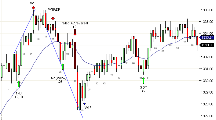 Si perdiste esa oportunidad, hubo una A2 en la vela 23, que también fue una buena entrada para swing. Todo el movimiento del ‘lunch’ tuvo solamente H1s fallidas en una tendencia dura, y podías entrar en corto en cualquier retracción que no tuviera sombra grande. Esto requiere de algo de práctica y frecuentemente las dejo pasar. Una A2 final en la vela 75 dio 6 puntos. Nunca es tarde para entrar con la tendencia en un día de tendencia dura.