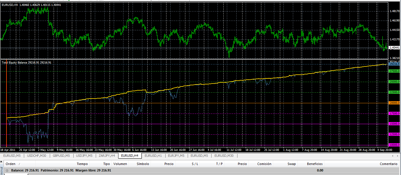 Por hoy nos conformamos con menos revalorización de la habitual. Está el mercado muy volátil y el eur/usd asomándose al precipicio de 1,40 que tiene el fondo muy abajo. Tenemos una operativa muy regular, sólo hay que ser prudentes cuando se ve el peligro venir, como es este caso. Otro tema es que te enganche un movimiento como el de ayer en los pares con francos suizos, por eso evito probar esta operativa en esos pares y en los que lleven jpy o gbp.