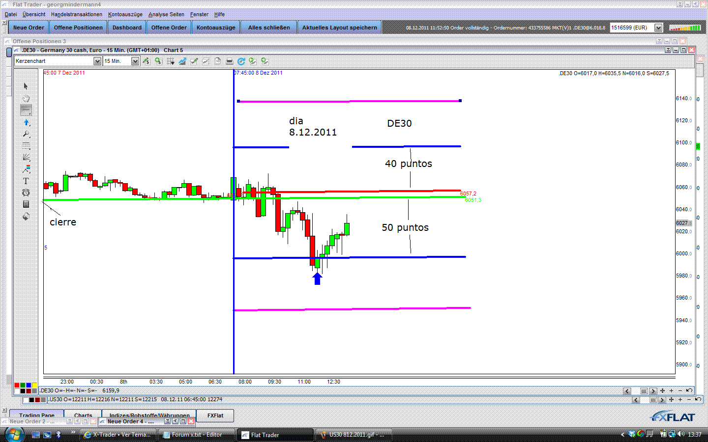 La entrada correcta hoy dia era en la primera zona larga a las 12:15h despues de la primera vela der Reversal de acuerdo con los DJIA FUT. Vease el grafico de US30 ( DJIA FUT adjunto ).Tengan en cuenta que negociamos CFDs .