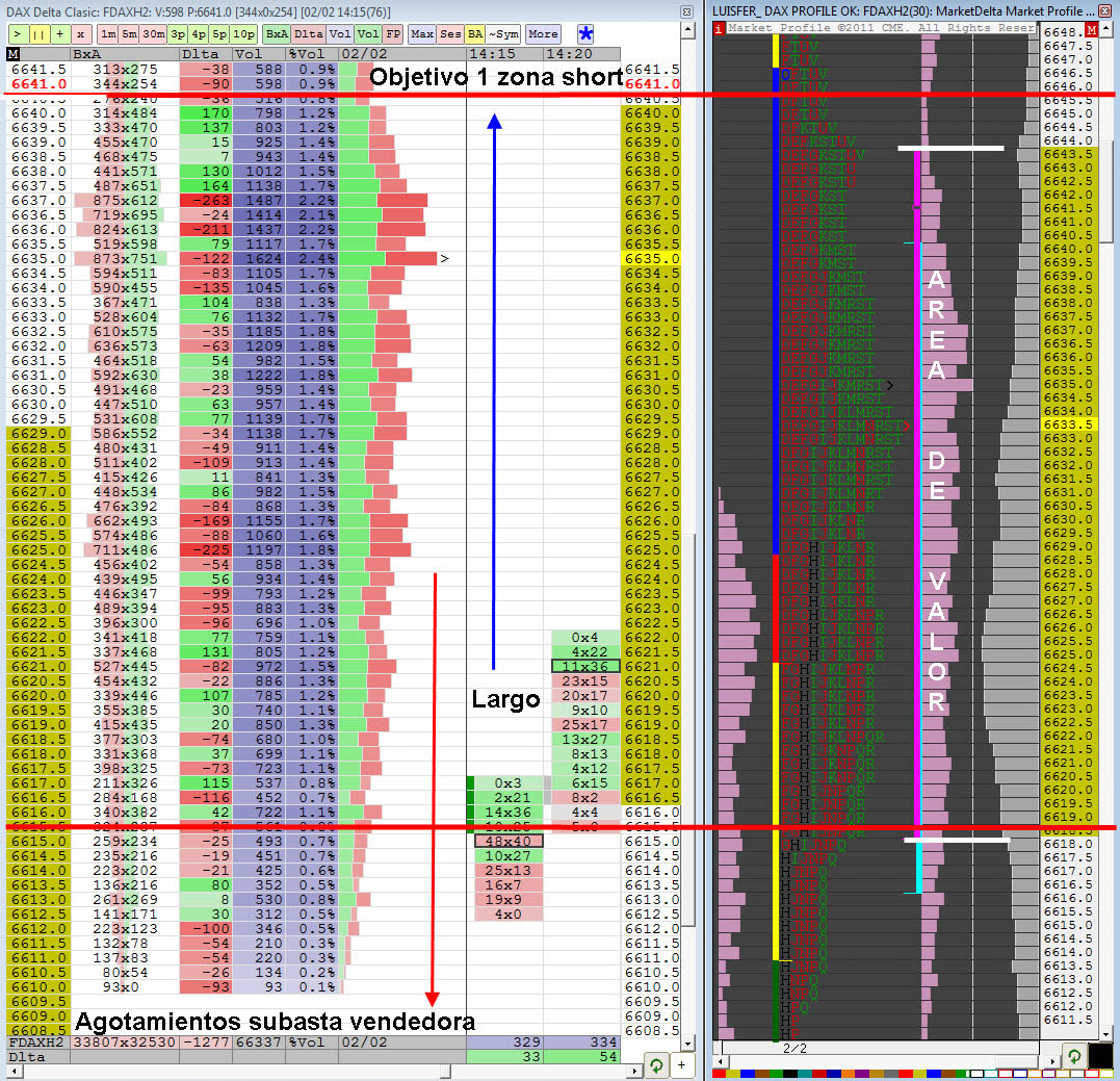 A las 9:45 cuando el precio llega a la primera zona short en el FDAX, el FDJI cotizaba a +45 puntos de la apertura, casi a los 50 puntos que puede marcar un día de tendencia, en esa misma hora el VDAX NEW caía con fuerza, incluso marcando divergencia en los primeros 15 minutos con el FDAX, anticipando los primeros movimientos al alza y el cierre del gap. Al mismo tiempo durante la media anterior el precio cotiza entre la 2ª y la 3ª desviación típica y por encima del ATR. El profile presentaba una forma elongada con tpos individuales y con escaso volumen que se podía comprobar en el Order Flow donde se producía un gap alcista en medio de la cotización, llegando a producir divergencias deltas, es decir deltas negativos con subidas del precio. Todo ello hizo que me quedara quieto en la primera zona de posible corto.