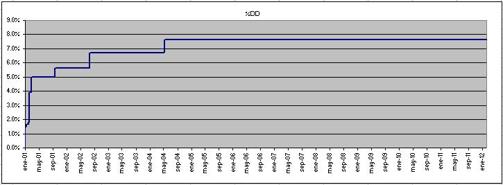 La buena es que, en el gráfico de maximo DD, hay un límite que parece que no se supera, una cifra de Maximo DD en 11 años(cerca del 8%) que es el límite de lo que podemos perder.