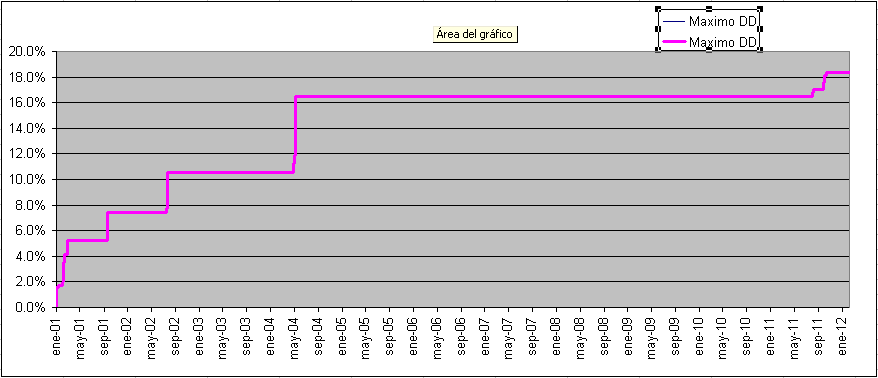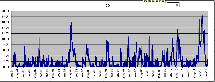 Como se ve, los DD son mucho mas grandes, más del doble. Y aunque pueda haber periódos largos sin superar el maximo DD historico (como entre los años 2005 y 2010), tarde o temprano se supera el maximo DD, en este caso se llega al 18% en 2011.