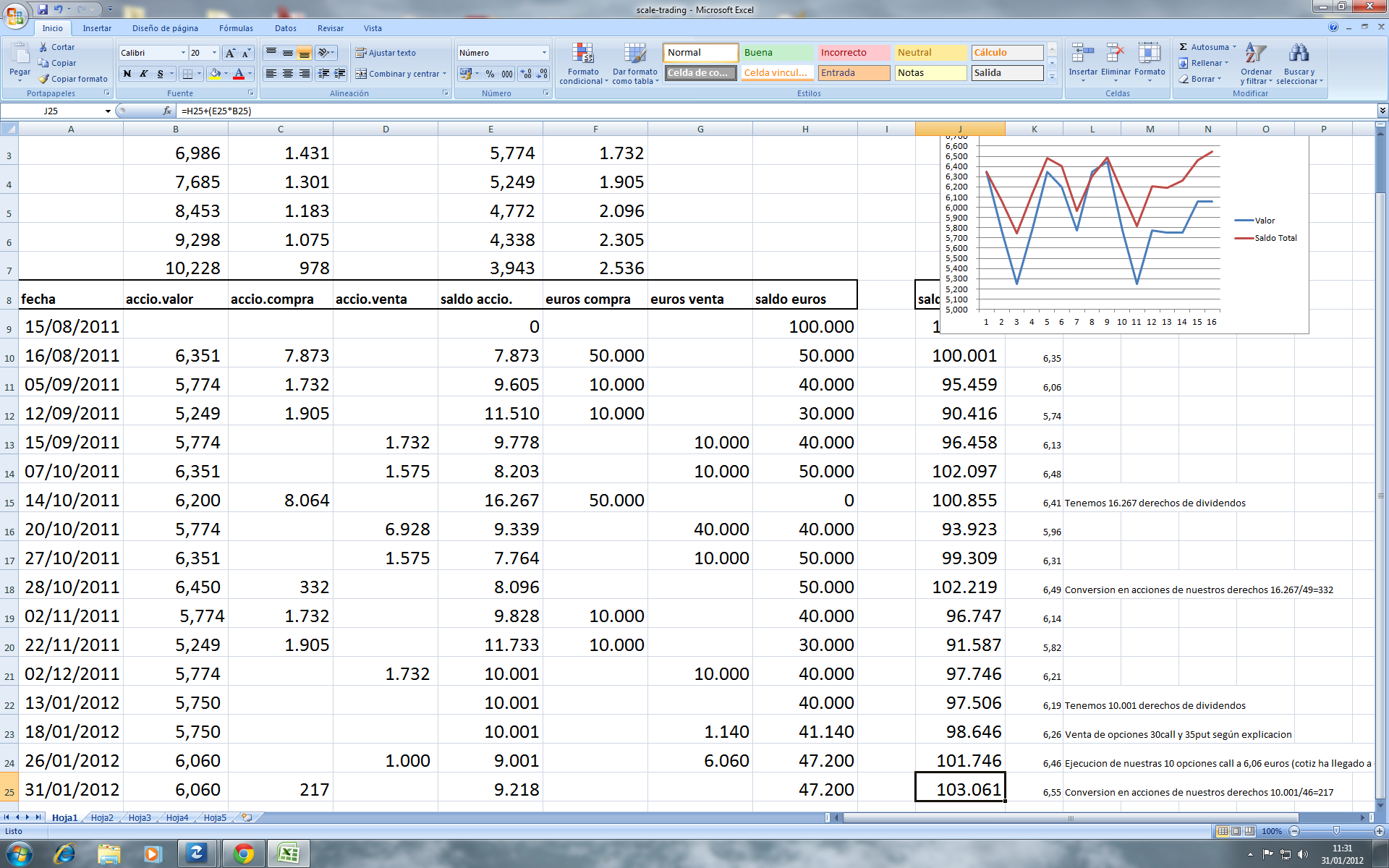 Pienso que vamos muy bien con este valor, solo hemos arriesgado un maximo de 60.000 euros (y solo en un momento de la estrategia), y ya llevamos unas plusvalias de mas de un 10% (sobre los 100.000 de capital inicial) y todo ello en solo 3 meses y medio, y encima nos daran otro pico en dividendos dentro de unos dias...