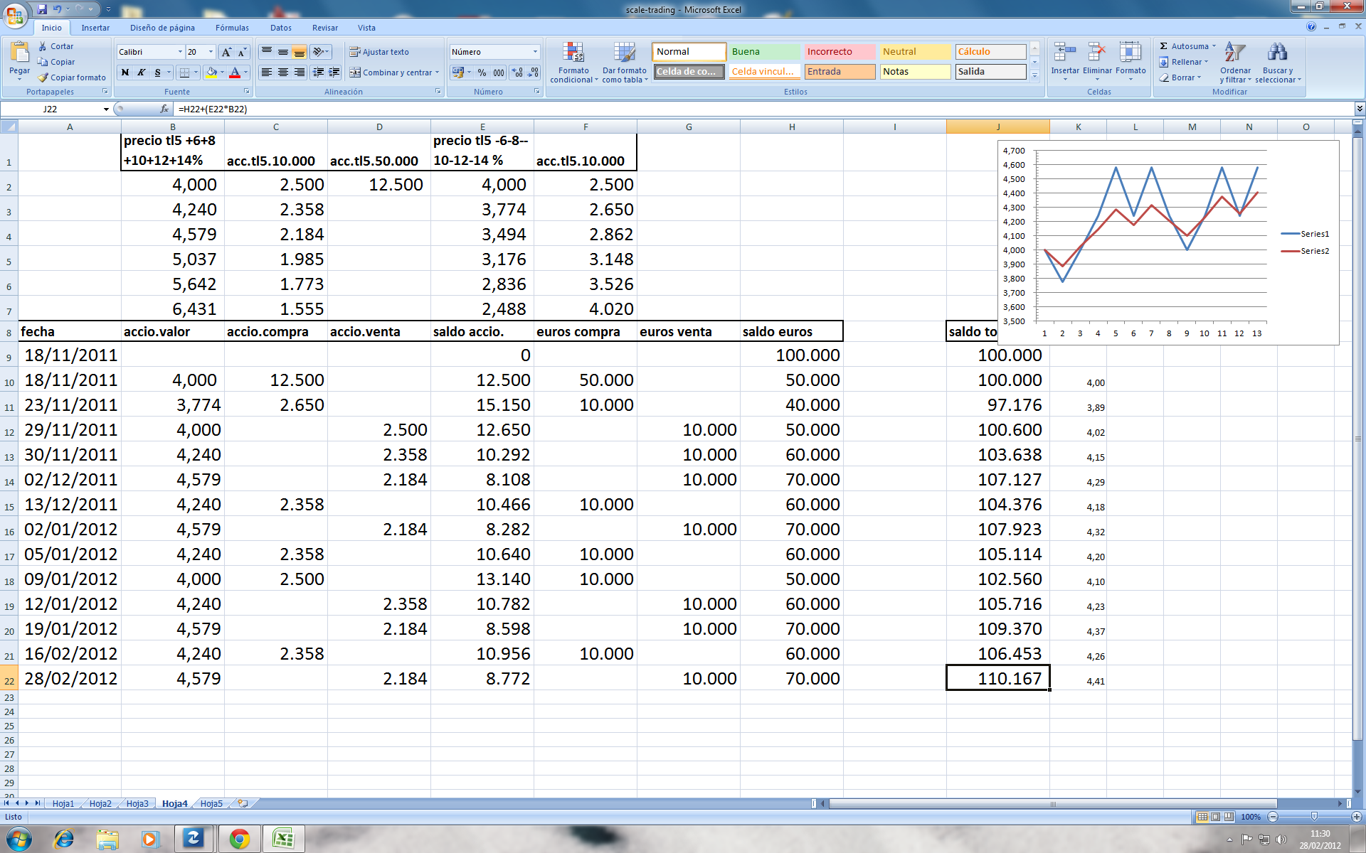 Esta estrategia la hacemos de forma "larga", es decir... al principio compramos un valor, nos guardamos la mitad en cash... y vamos segun las reglas puestas desde el principio, pues, comprando o vendiendo 10.000 euros de valores...
