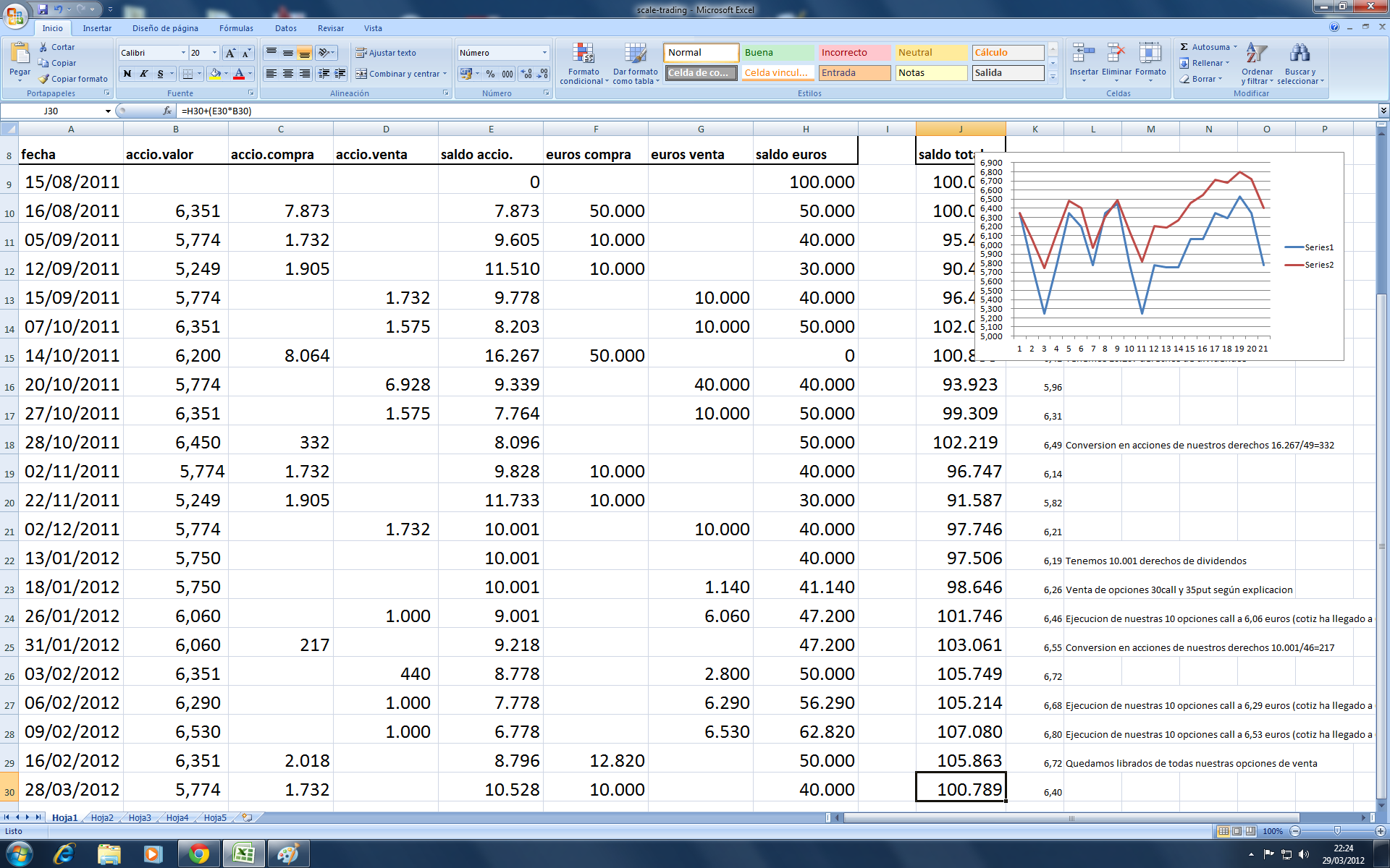 La teorizacion si que es mas sencilla, pero ya tengo pensado lo que hare, cuando me venzan las opciones de marzo, modificare los valores de la escala, y los ajustare a los valores de las opciones... asi me coincidiran tanto las escalas como las opciones que venda...