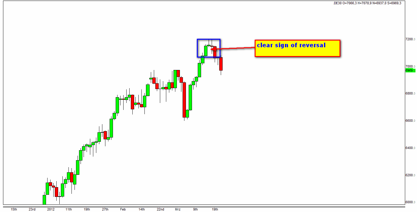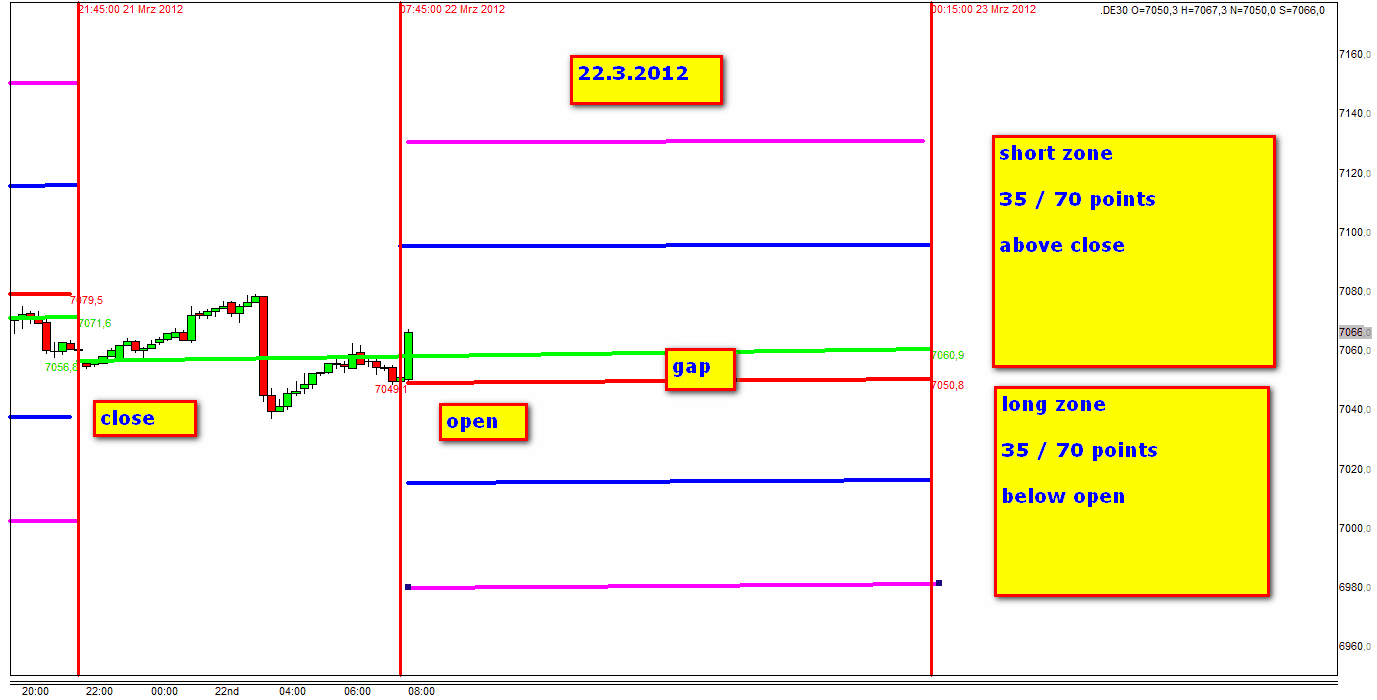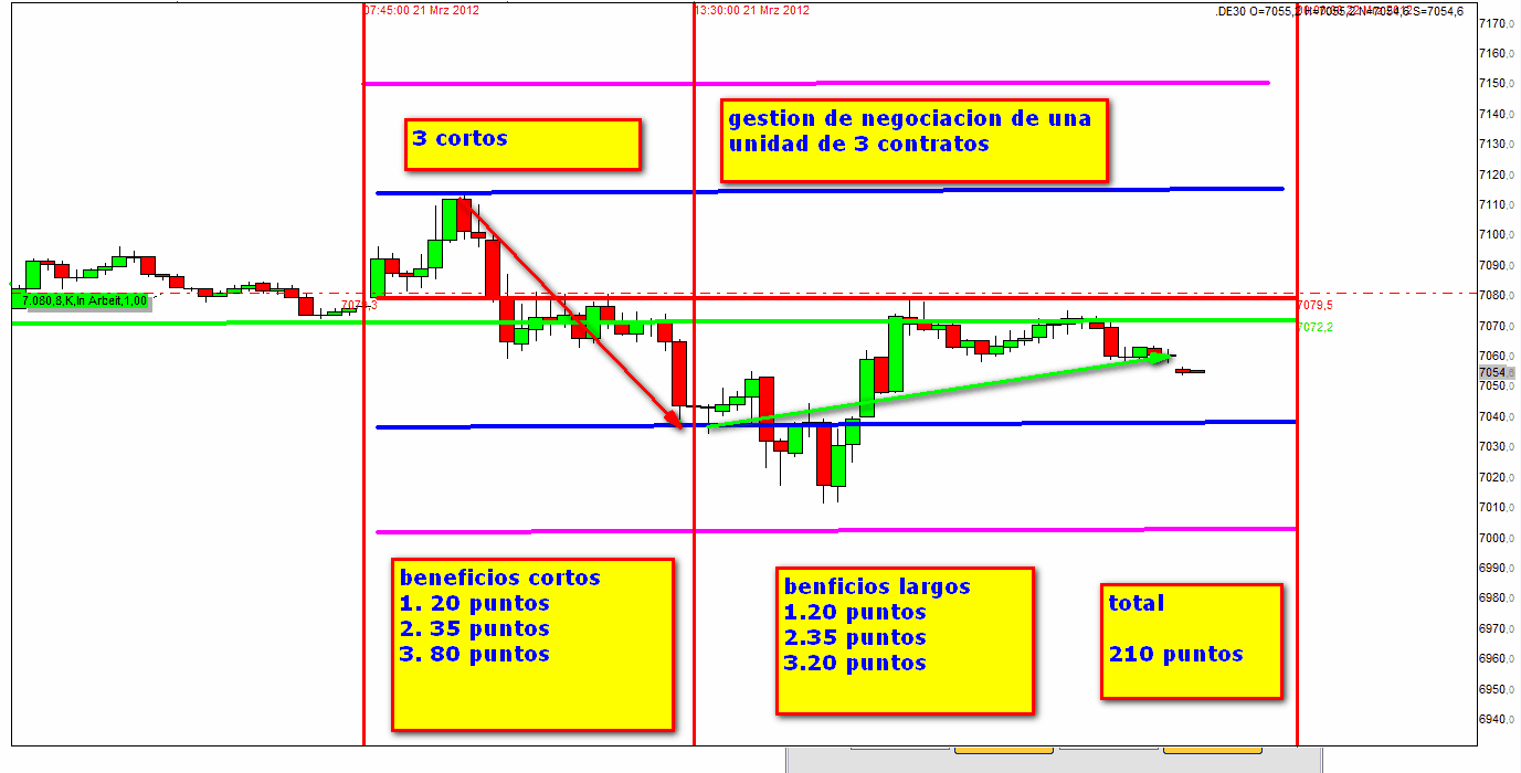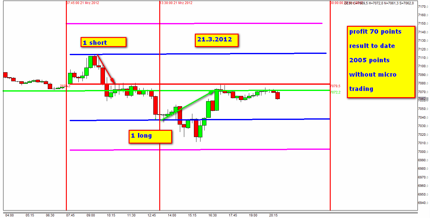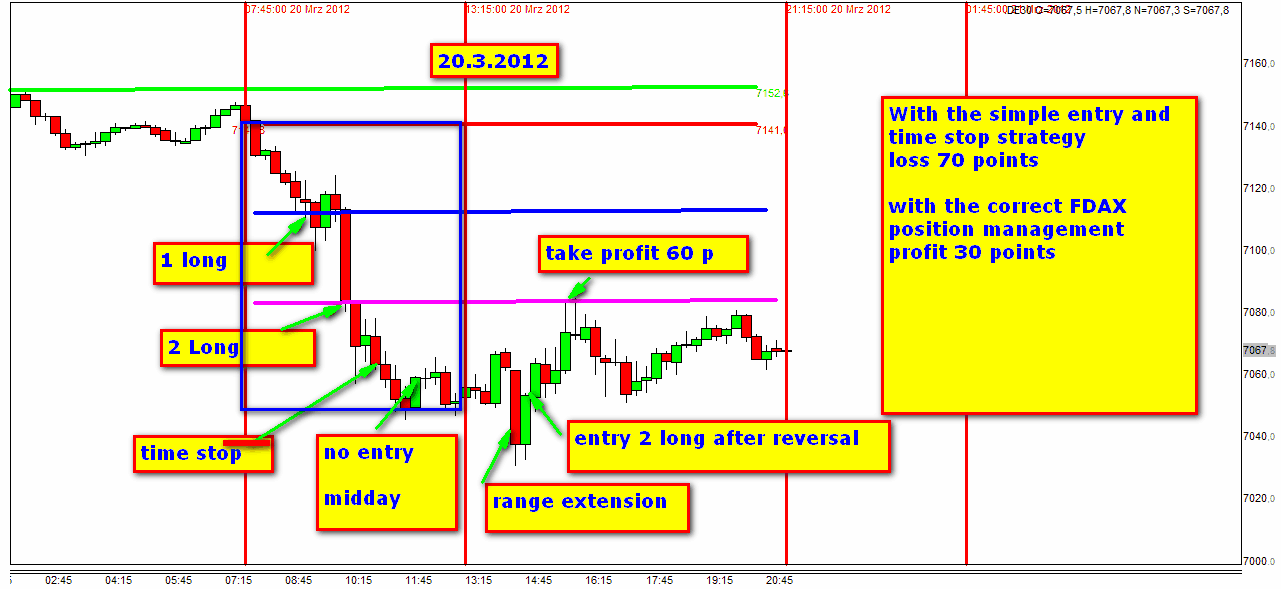 Sin tener en cuenta estas entradas sofisticadas, parte de la plena FDAX-TRADING-STRATEGIE, el dia habria terminado con una perdida de 70 puntos incluido el time stop. Sin embargo como arriba indicado el benficio era 30 puntos.