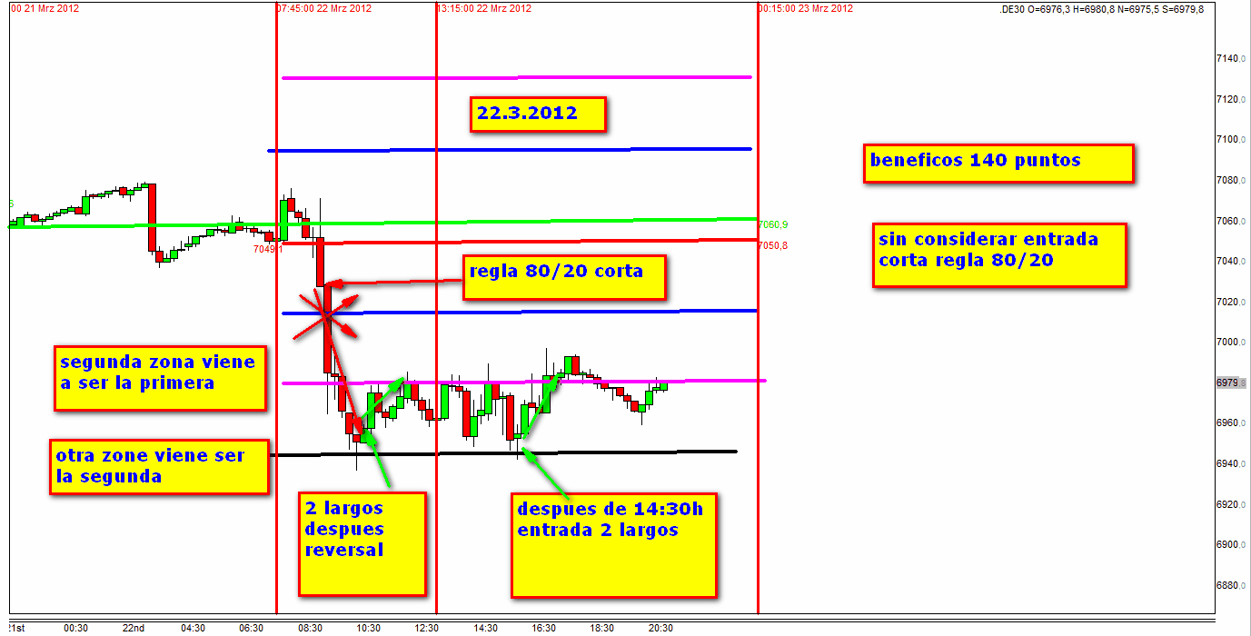 4. Despues de 14:30h hoy 13:30h ( debido a la hora verano USA ) se entra con una vela de reversal despues de extencion del rango o bien si no hay extencion si el precio cruza de abajo la 2. zona. Solamente si ocurre lo ultimo se abre una 3. zona.