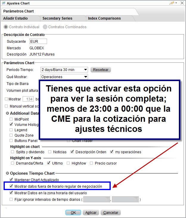 En IB una vez que tienes el gráfico abierto, tienes que pinchar con el botón derecho del ratón encima del gráfico y clickar en PARAMETROS DEL CHART.... luego activar "MOSTRAR DATOS FUERA DE HORARIO REGULAR DE NEGOCIACION"... y así con todos los demás instrumentos, si quieres ver el HORARIO REGULAR o el HORARIO EXTENDIDO (overnight) o también puedes elegir INTERVALO DE TIEMPO.