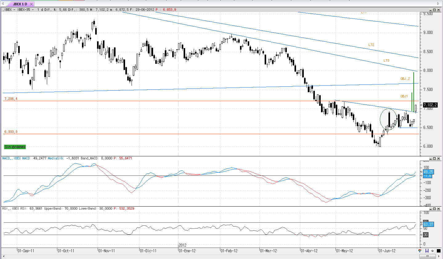En cuanto al Ibex si es cierto que ha roto figura al alza de h-c-h invertido descendente, pero estoy cauteloso porque los valores grandes como san,bbva,rep etc, no han superado el máximo que se realizó el DIA 11 de junio, solamente telefónica lo ha superado por escaso margen; pero si obviamos este día, todos menos Repsol han roto figuras al alza y entonces sea un posible cambio de tendencia. La duda esta servida: ¿cómo actuar en estos momentos?.