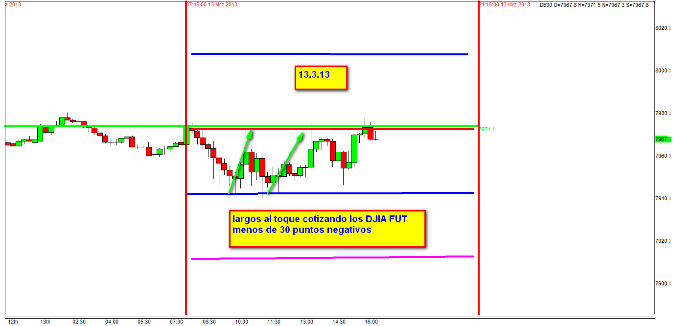 Durante dias alzistas procuramos de obtener con un largo 30, con otro 50 y con el tercero otros 70 puntos. Con vola VDAX menos 20 reentrada larga si un contrato ha ganado 30 puntos y el precio retrocede al nivel de la entrada anterior. Al cierre reponemos los largos vendidos.