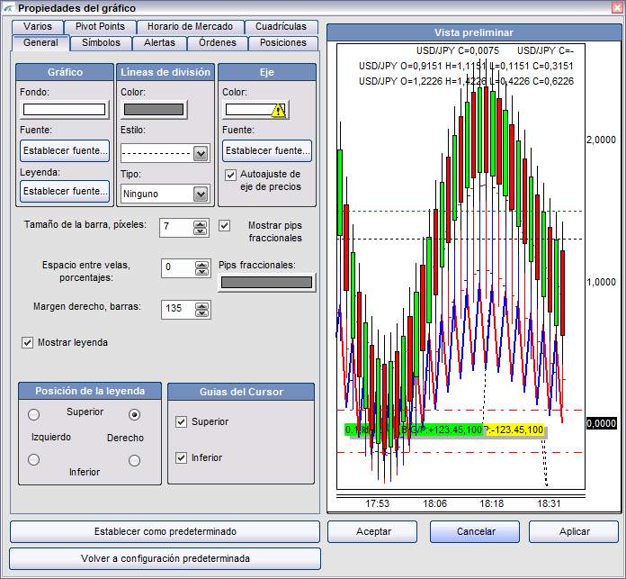 La configuracion de los graficos se realiza, aparte del time frame, con las propriedades del grafico adjunto.