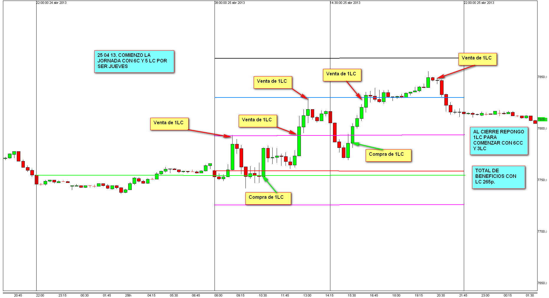 Comencé el día con 5LC en vez de 3LC por consejo de Georg, al tratarse de jueves. Vedía el primer LC en Z1C, tras eso el precio bajó hasta cierre/apertura donde compré otro LC. Ese mismo LC se vendió de nuevo en la Z1C. Al llegar el precio a la 2ZC, vendí otro LC.