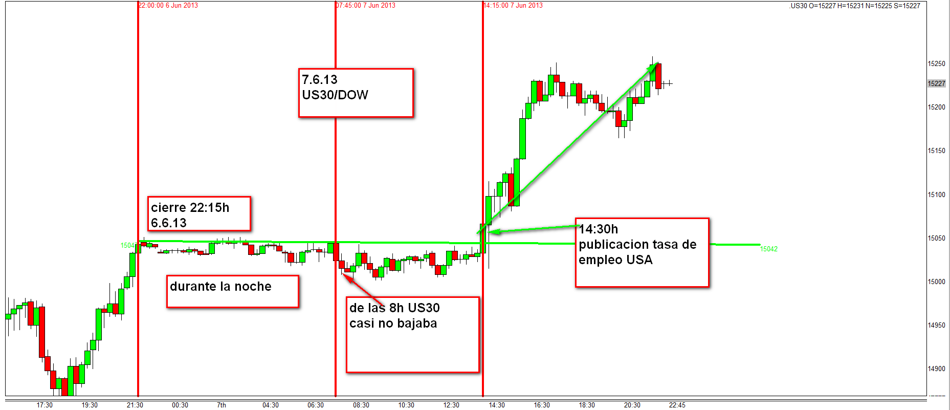 Antes de las principales publicaciones como los datos del mercado laboral de EE. UU. y las decisiones sobre tipos de intereses de la Fed, en un contexto alcista suele haber subidas de precios. La tasa de paro se publica el primer viernes del mes y las primeras solicitudes iniciales de subsidio de desempleo, cada jueves a las 14.30 h (hora de Europa Central). El Federal Open Market Committee se reúne periódicamente ocho veces durante el año natural. En estos días la apertura de una posición larga no sigue necesariamente una regla, y no deben abrirse posiciones cortas antes de la publicación.