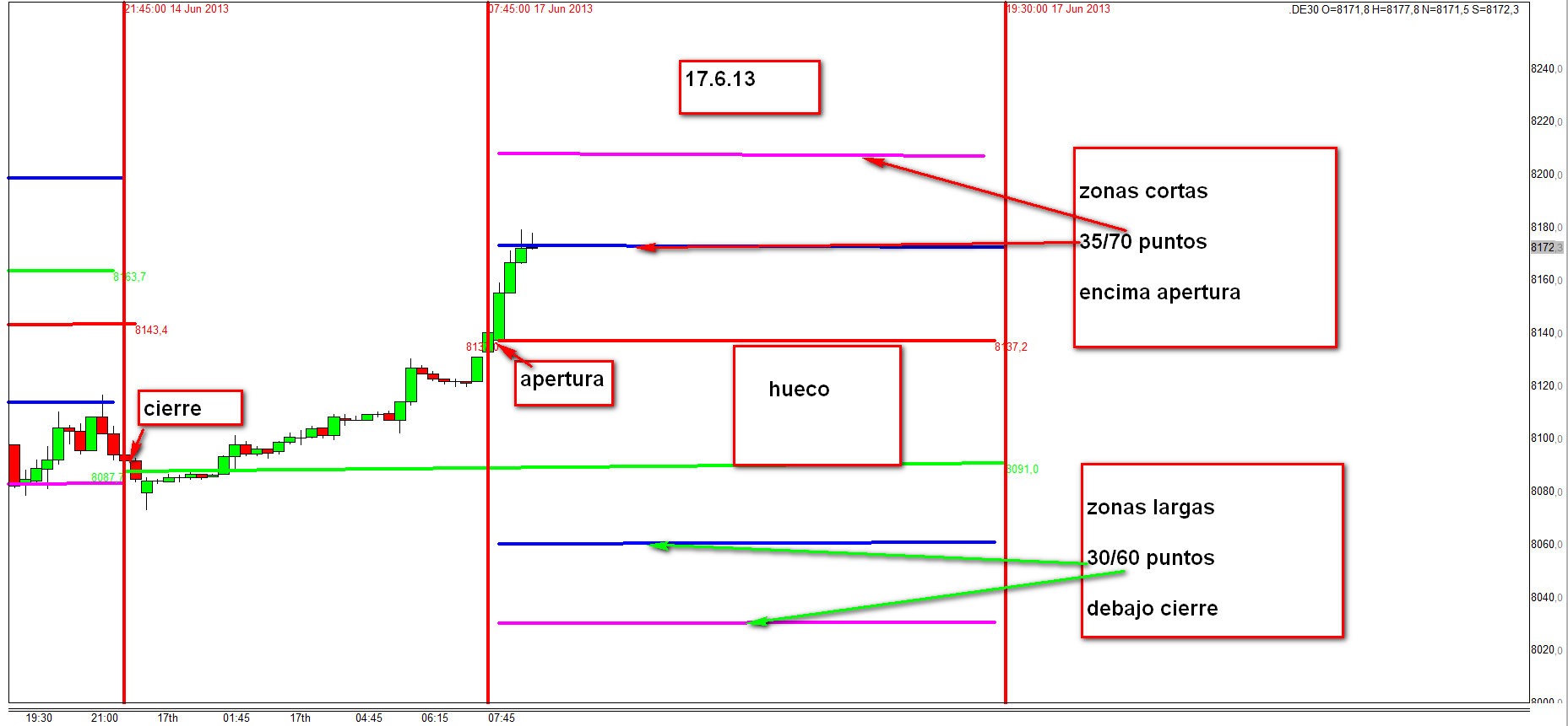 El trading de huecos es mucho mas dificil que aparece. La zona de apertura y cierre del dia anterior, la diferencia crea el hueco, es la zona de incertidud.