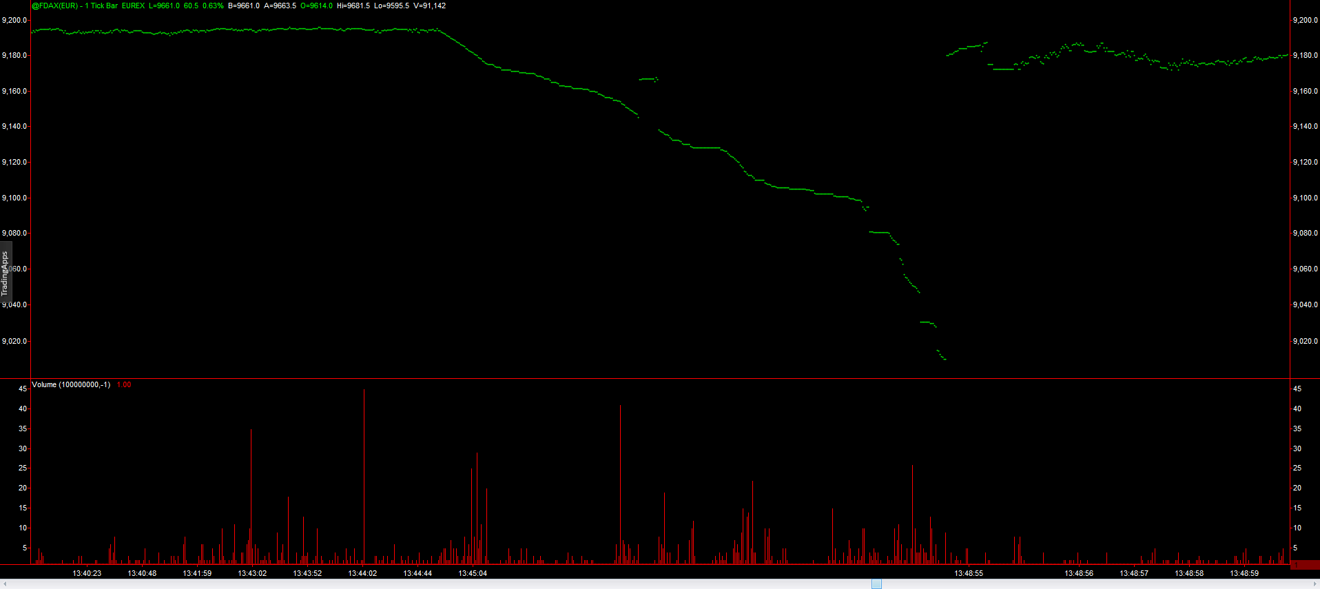 Parece que los tiempos no cuadran en esas "fotos". En el gráfico de velas de 1 seg., se ve que el pincho ocurre a las 13'45'00h, mientras que en el de ticks, el pincho se prolonga hasta las 13'48h, que no fue así. Supongo que debido a las dificultades de ordenar los acontecimientos, como decía cls, los softwares han hecho lo que han podido. Supongo más realista, sobre todo, la evolución del precio representada, y también, pero quizá en menor medida, los volúmenes.