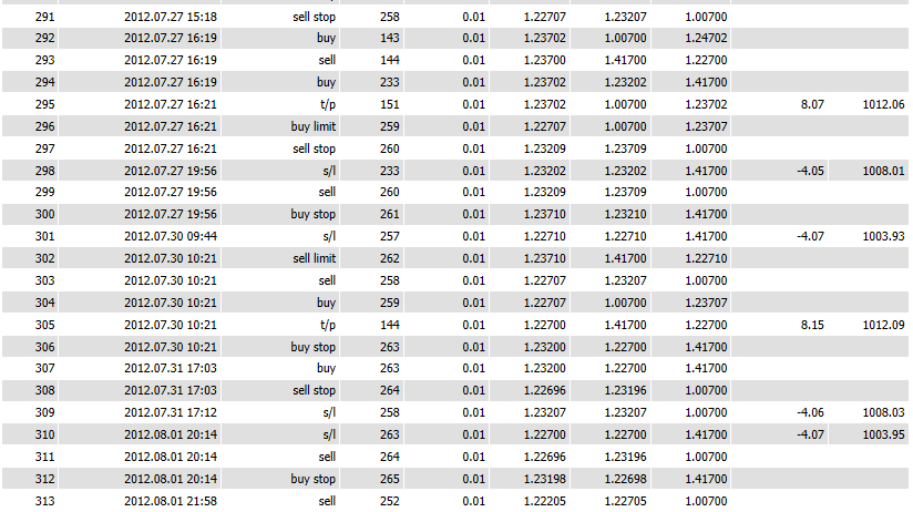Ejemplo: abro BUY STOP en 1,3701, el precio se va hacia abajo 50 p y toca 1,3651, en ese nivel justo creo que debería abrir dos órdenes: una contraorden SELL STOP que protege la BUY de 1,3701 y otra SELL STOP llamémosle original de apertura de posición y que esperamos cerrar en TP 100 p más abajo (ya que estamos jugando a dos bandas, por arriba y abajo del 1,37). Esto es así para cada nivel de 50 p que visite el precio, si ahora el precio se va hasta 1,3701 de nuevo, debo cerrar la contraorden SELL protectora de la BUY STOP original de 1,3701 perdiendo en este cierre -50 p y abrir otra BUY STOP que será la protectora de la SELL STOP que acabo de abrir en 1,3651 y que ahora está en pérdidas latentes. Si el precio me chulea y se vuelve a ir a 1,3651 la contraorden BUY que acabo de abrir en 1,3701 llega a su SL y pierde otros -50 pips, de modo que el viaje de ida y vuelta de 1,3701 hasta 1,3651 y de ahí a 1,3701 y por último a 1,3651 de nuevo me ha costado -100 pips. Y así en cada baile entre niveles de 50 pips.