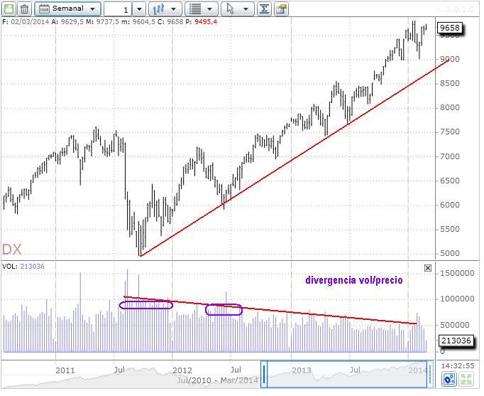 Alguno me podría esgrimir que, a más valor del índice, podría darse el caso de una reducción de volumen proporcional, ya que el valor fundamental del índice (futuro Dax-30 a 8.000=200.000€ vs. 9.000=225.000€) ha aumentado, pero ese argumento no me vale puesto que la bajada de volumen de contratación está a años luz de la subida proporcional del índice. No se si me he expresado bien pero creo que todos me habéis entendido en lo que quiero decir.
