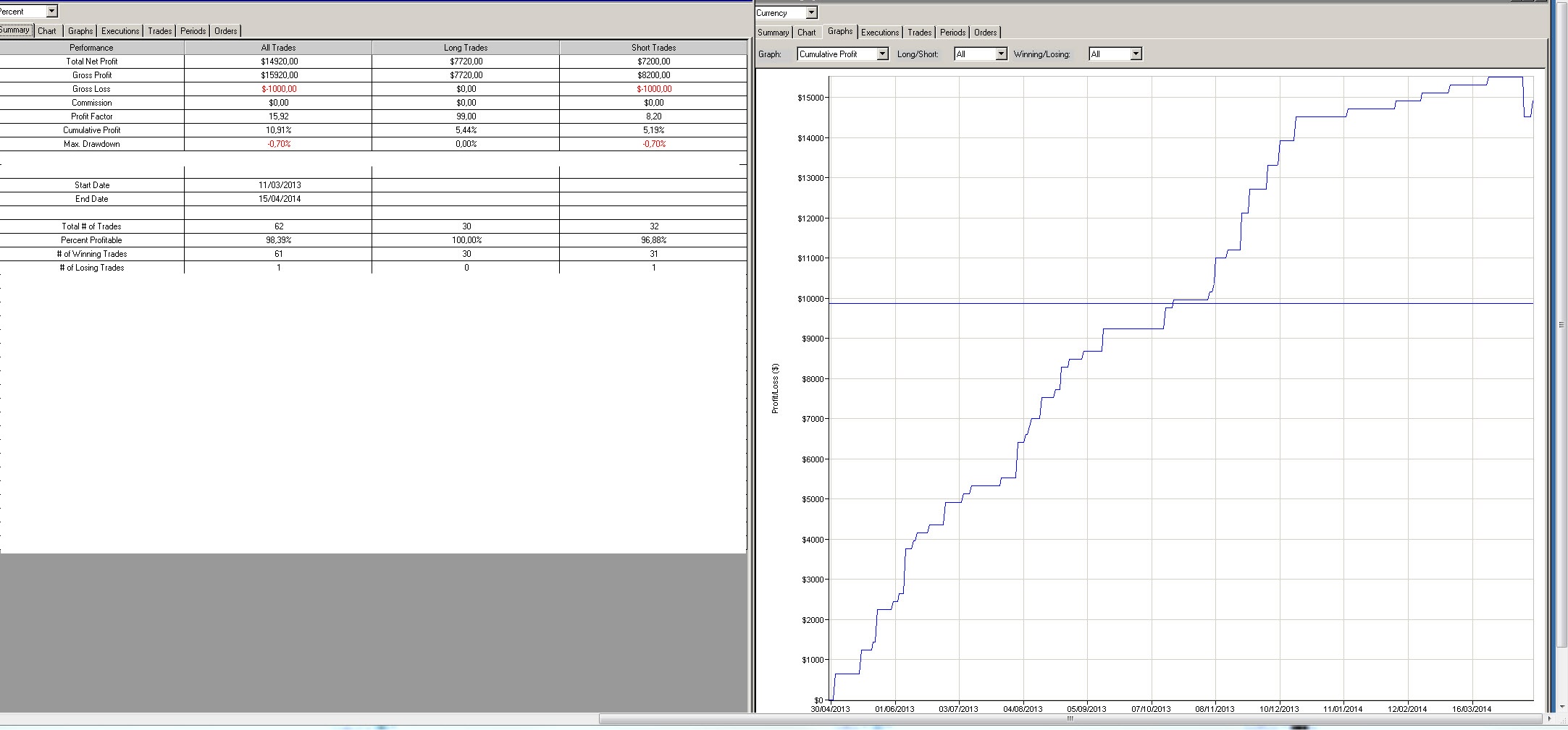 Pues si éste no es el sistema perfecto, se le parece mucho, un único trade perdedor en un año y PF de 16, IMPRESIONANTE. En lugar de reducir el PF le has doblado.