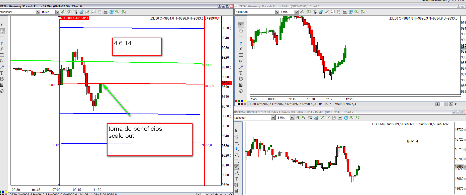 2. Adjunto mi pantalla de hoy muy simple con 3 graficos. Al tomar una posicion quiero ver por lo menos un poco