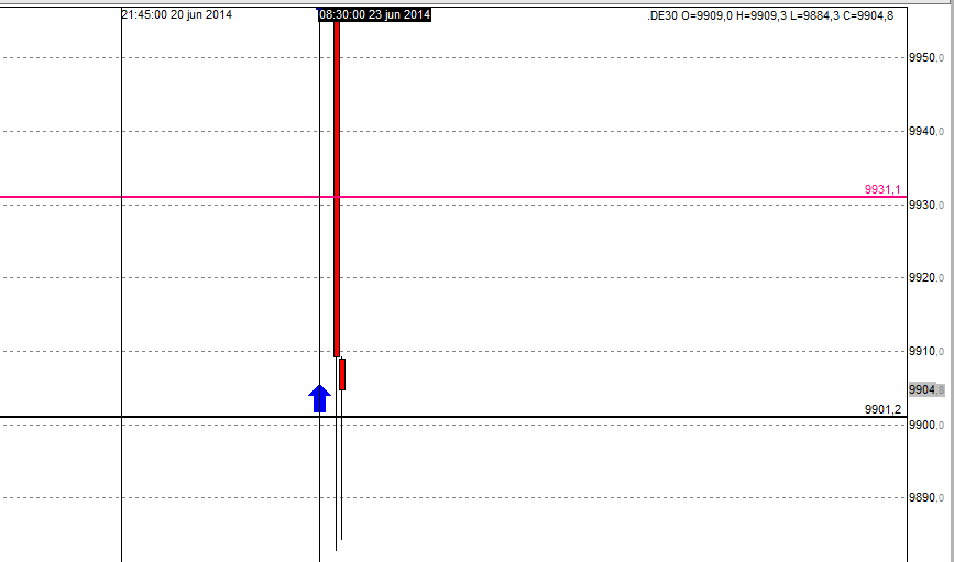 Pues ese día 13.6.14 tan perfecto no está tan claro, a ver veamos entrada en z1L al toque o con la reverse cercana, da igual, el precio cae y llega a la z2L, tenemos vela que cruza de abajo a arriba y le metemos 6, aplicamos timé stop y salimos en el mínimo, pues estamos por debajo de nuestra entrada unos puntitos importantes después no hay reverse fuera del valué área y la entrada del open a esa nueva línea negra pues como que es nueva. Día de pérdida importante, no se qué es lo que ven pero eso es lo que claramente marca la estrategia :(