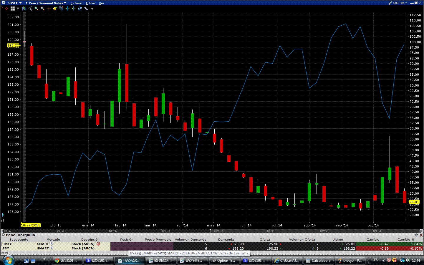 Mi criterio de que en caso de subidas, UVXY se revalorizará más que VXX se basa en la simple aplicación del interés compuesto, si evolucionan subiendo UVXY el doble que VXX, tendría que funcionar, de todas formas, he colocado un indicador en el excel que me va a ir señalando si esto se esta cumpliendo.