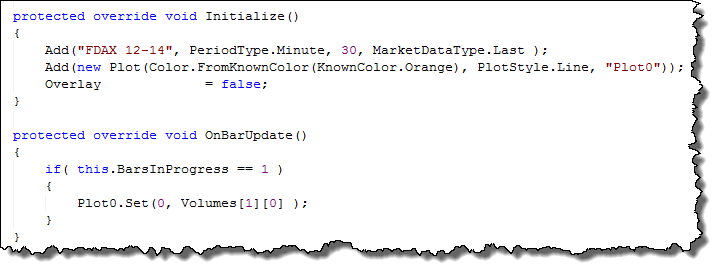 Créate un indicador con el siguiente código y lo cargas sobre el FDAX 03-15 para que te muestre en un panel el volumen del FDAX 12-14. En 30 minutos.