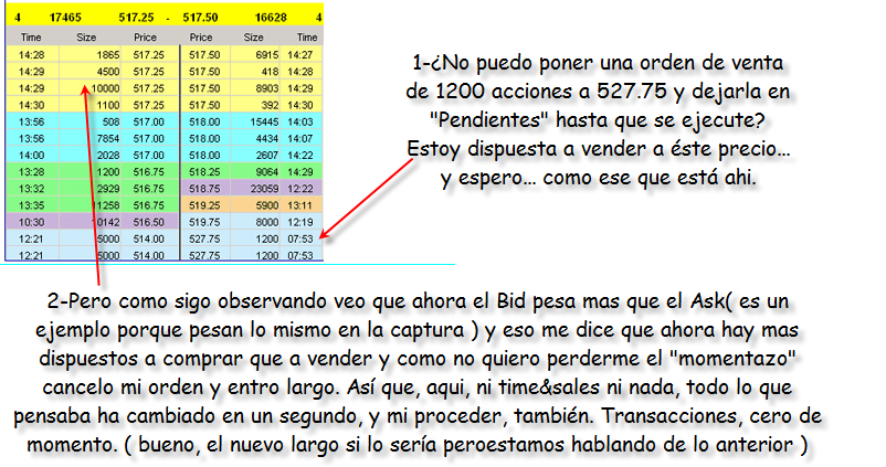 Lo que también está al orden del día son las órdenes ocultas. Decir que quieres vender 100 acciones cuando en verdad estás vendiendo 15000. Estos movimientos se ven perfectamente en el time&sales. El unico inconveniente es que como estás "mintiendo" eres el ultimo de la lista (en el ECN que te pongas y permita ordenes ocultas) al venderlas, juacs.