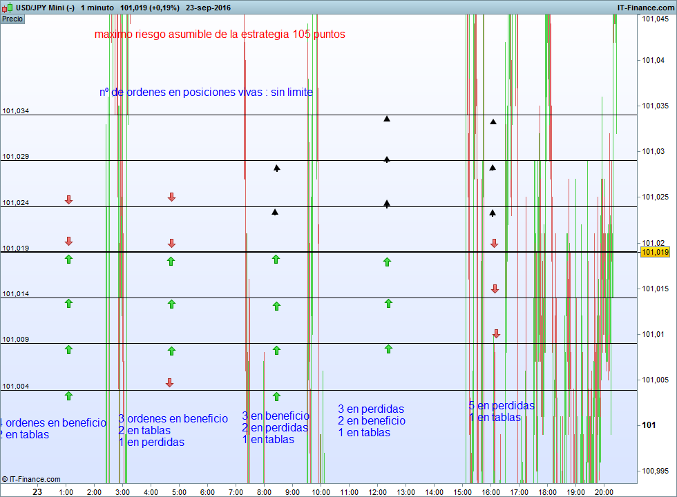 Ahí la filosofía que sigue la estrategia es cerrar cuantas mas ordenes se puedan en beneficios sabiendo que al final queda una perdida latente en posiciones vivas en algunos escenarios, pero esto se aplica en forex por la liquidez y porque permite dividir el riesgo global en fracciones a tu gusto metiendo el volumen preciso en cada entrada, en futuros hace falta una cuenta muy grande al trabajar con contratos grandes y los índices no se prestan tan bien como el forex a estas estrategias por el sesgo que tienen, los índices son mas direccionales, en forex hay mucho retroceso aprovechable, en índices como te equivoques inicialmente con la tendencia no compensa el trabajo que lleva para cerrar en tablas o con pequeños beneficios, sale mas a cuenta asumir la perdida inicial y posicionarse a favor de tendencia, menos trabajo, mejores sensaciones y mas rendimiento.