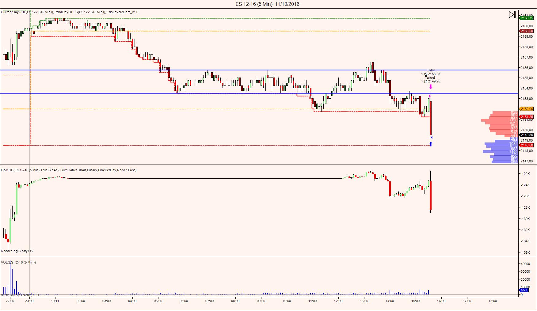 Así ha terminado el día de hoy. Mejor timing de entrada en mi operación imposible. Este es lado malo de tener un profit target fijo y ser disciplinado en su ejecución. Estoy acostumbrado a perderme grandes movimientos después de mis entradas. A cambio un profit target fijo me permite tener a raja mi emociones y me hace mejor operador. Esta es una de las razonas por la que también quiero ir con 2 contratos, así tengo la posibilidad de dejar correr uno de ellos cuando sea algo más codicioso.