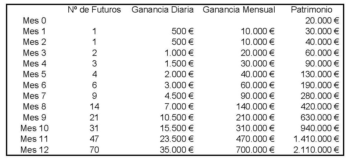 Con unos 20.000€ un broker ya te permite comprar un futuro del DAX. Si le sacas 20 puntos son 500€ cada día. Si operas 20 días al mes supone una ganancia de 10.000€ mensuales. En dos meses ya habrías ganado 20.000€ y podrías operar con 2 futuros, ganando ya 1.000€ diarios en el tercer mes y así sucesivamente. Te dejo el cuadro donde se ve que al final del año tendrías un patrimonio de más de 2 millones de euros y lo habrías multiplicado por más de 100 en un año.
