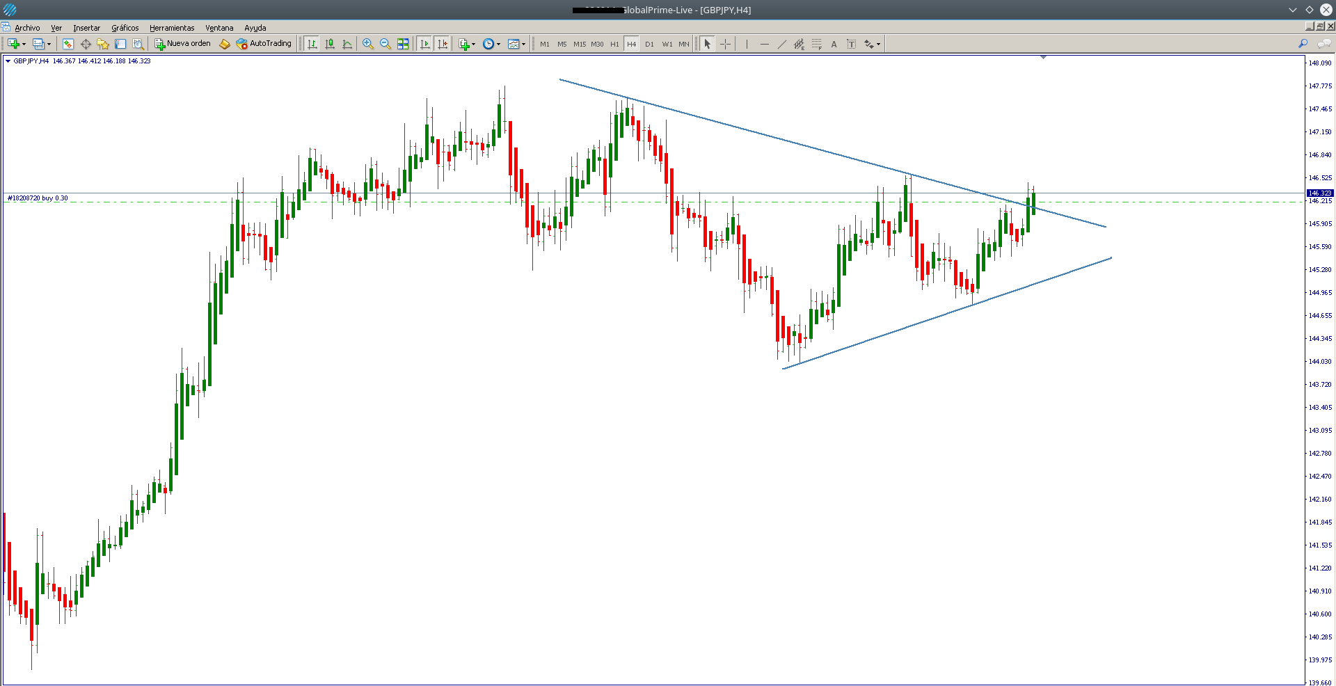 poco que contar, despues de ir ganando unos +60 pips, hubo un reset del precio y vuelta a entrar long en 146.285.