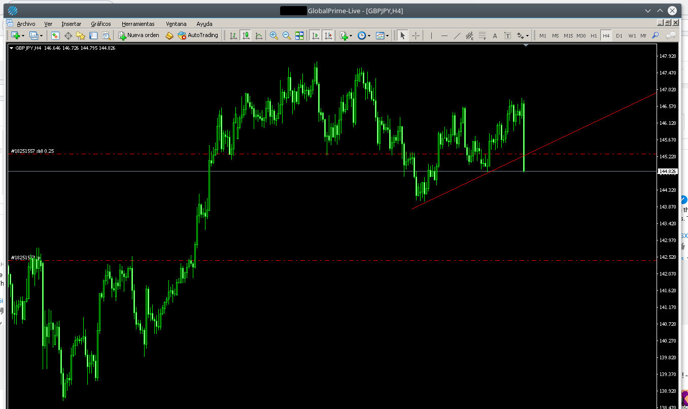 poco que contar, despues de ir ganando unos +60 pips, hubo un reset del precio y vuelta a entrar long en 146.285.