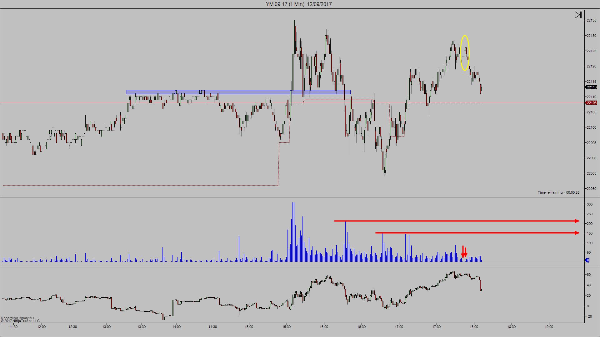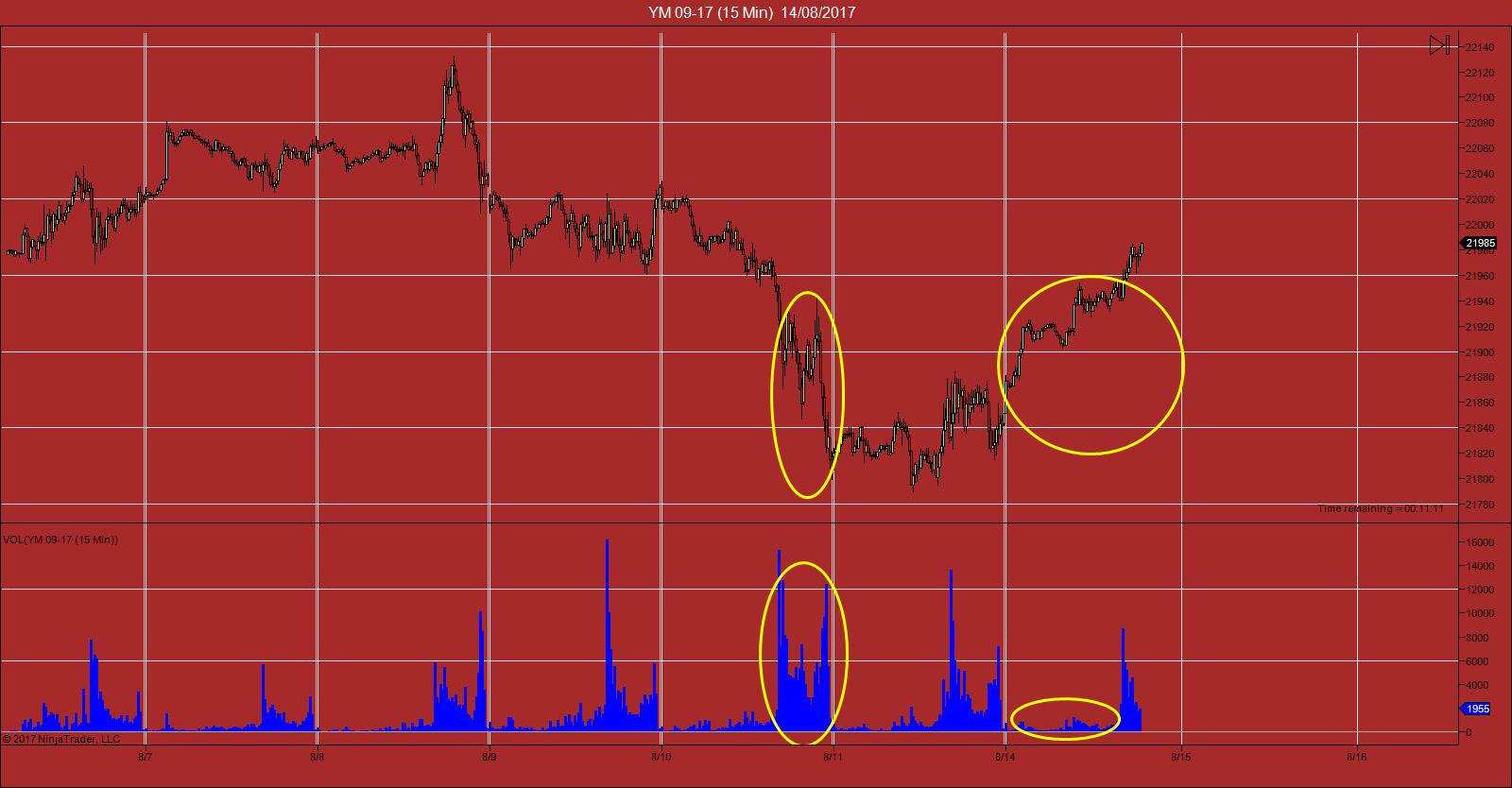 Mira en la foto, hoy los climax de vol no tenian casi ni 200 contratos, y algunas velas que he marcado en el circulo, casi casi nada de vol. Espectacular. Fijate que hasta he dudado de si estaba en un contrato antiguo y todo...