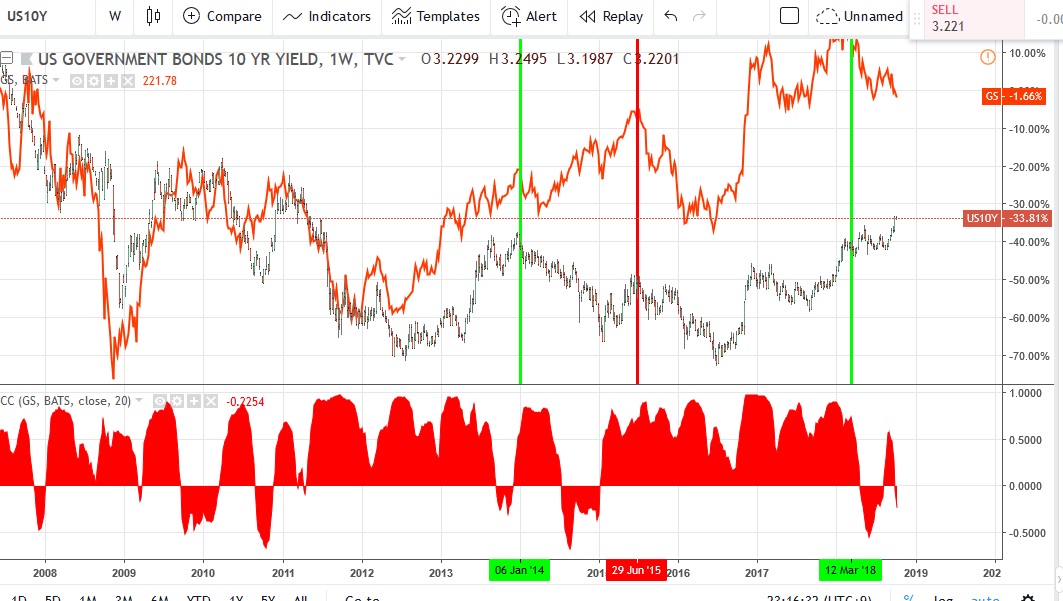 Dejo aqui en verde las ultimas vezes que la correlacion de los tipos de 10Y y goldman sachs se invirtireon (a candels la curva de tiposm linea roja goldman sacha, linea vertical verde quando las curvas se descorrelacionan, y linea vertical roja quando vuenven a corrlacionar.se