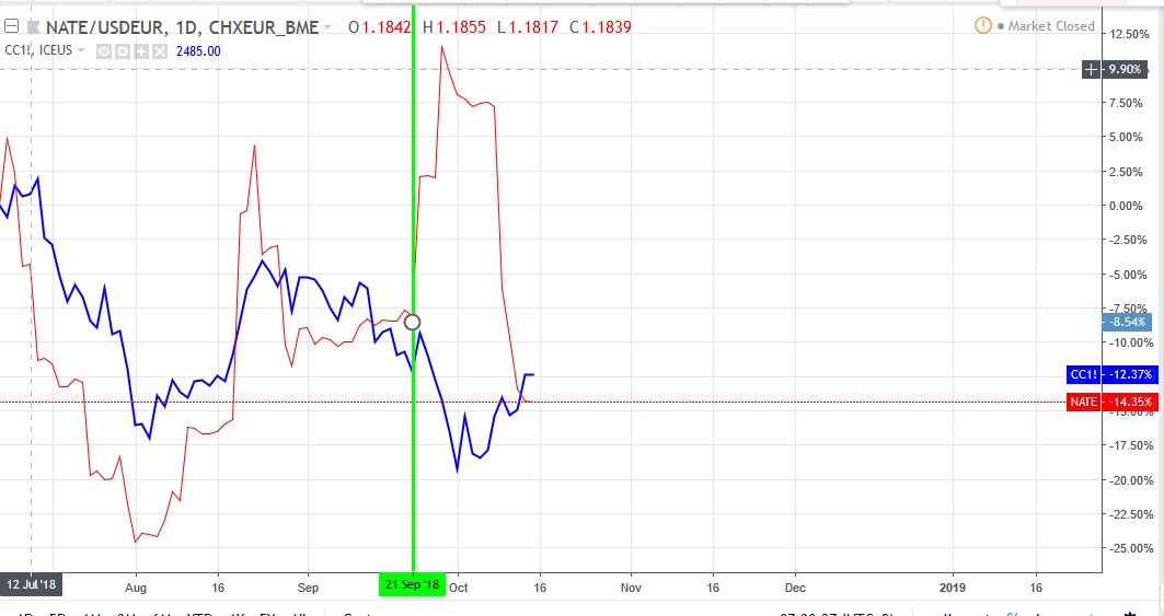 Pero si ay una correlacion muy cercana con el precio del cacao y Natra