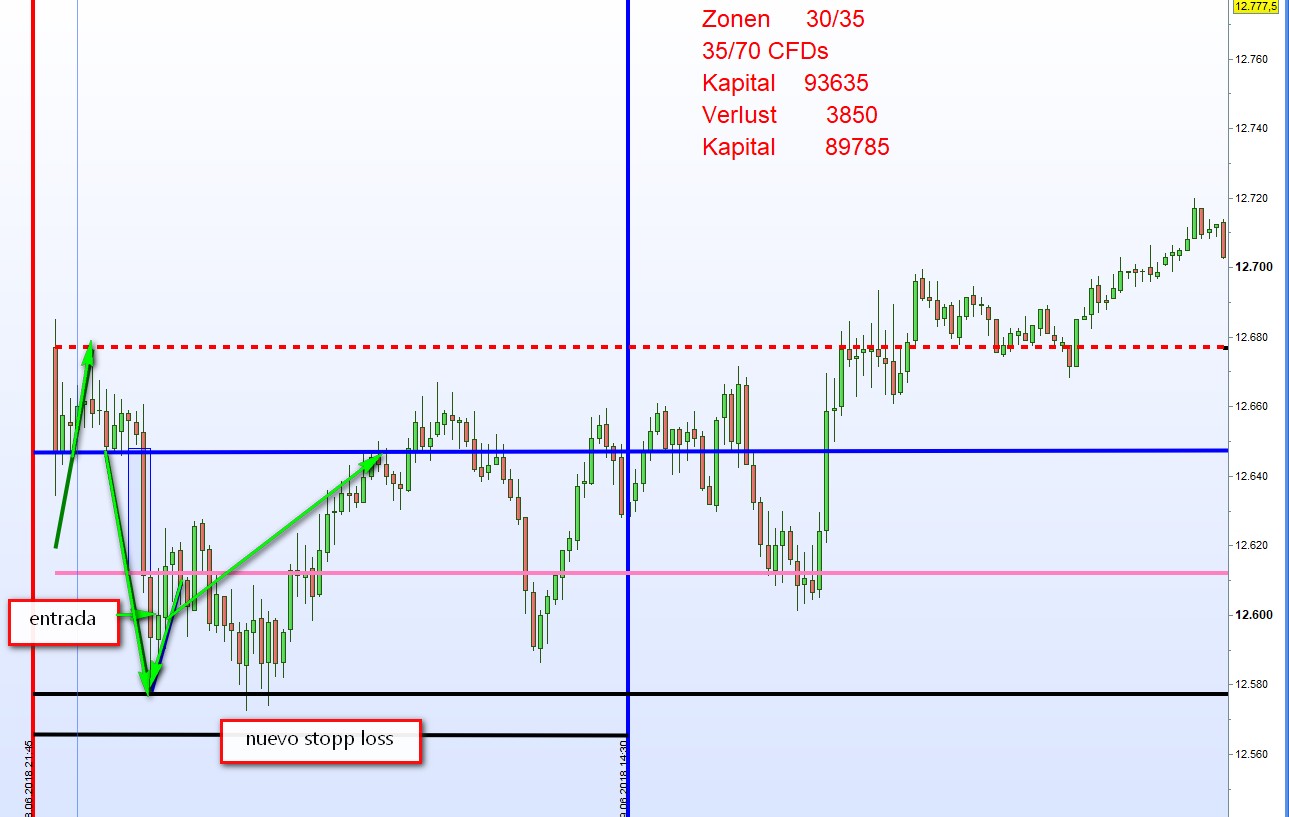 Como ya anticipado empezare a partir del 7 enero el trading de la FDAX-TRADING-STRATEGIE con un capital inicial de 5000€. La operativa comienza con 2 y 4 CFDs. En principio los resultados diarios seran documentados continuamente con un grafico. Adjunto otra vez el texto basico de la estrategia. Segun la situacion unas reglas adicionales seran explicadas y el lector tiene la posibilidad de anadirlas. El resultado simulado para 2018 ha sido mejor que en los anos precedentes. Esto se debe en primer lugar a la mejora de las aperturas de posiciones en las segundas zonas. Aun asi el trading no es pan comido y los posibles participantes comprenderan pronto que es su propria personalidad de actuar que sera el reto mas importante. Lectores que desean una ayuda personal a esto respecto me mandan un mensaje privato.